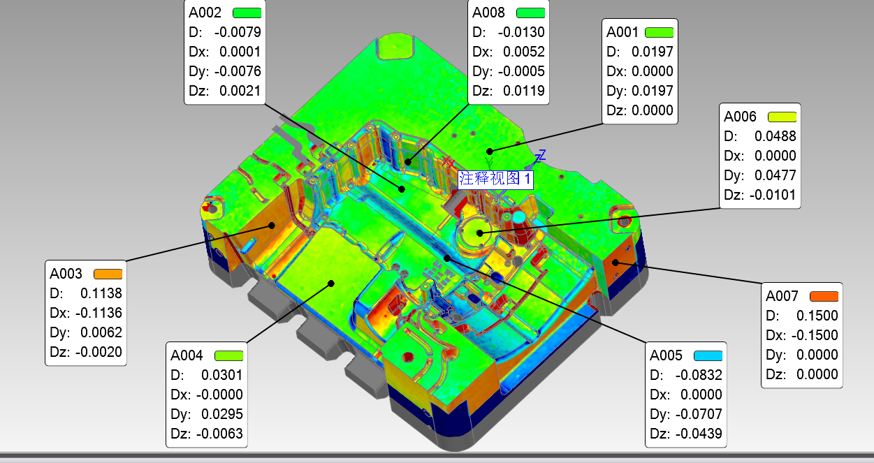 在本次扫描中,我公司通过使用PRINCE775手持式激光三维扫描仪快速准确地获取模具型腔的三维数据,处理后得到其精准的表面尺寸,与数模进行比对得出偏差色谱图及尺寸偏差图,为其后期处理提供了非常好的基础,同时也大大提高了工作效率。